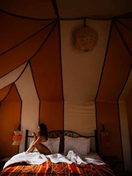 En la agencia contamos con campamento propio en el desierto de Erg Chebbi. No imagináis cómo es hasta que llegáis aquí. Cuenta con 8 haimas de lujo con baño y ducha privada, por lo que su limitado aforo hace que sea súper especial alojarse aquí. Tras una cena de lo más exquisita a vuestra llegada, nuestro personal os brindará un concierto con tambores bereber alrededor de una fogata bajo un manto de estrellas.